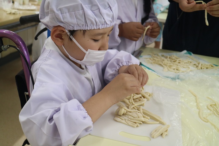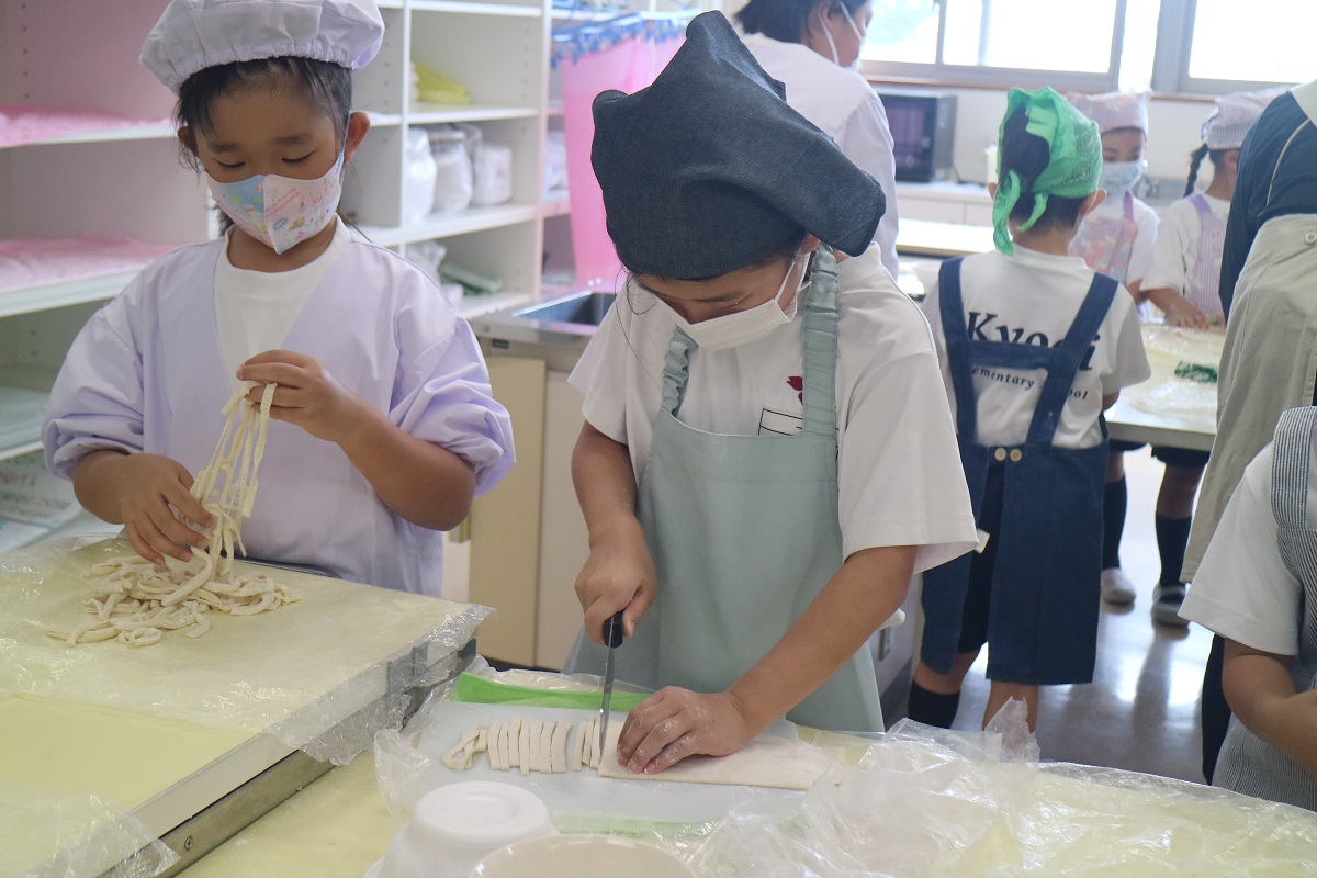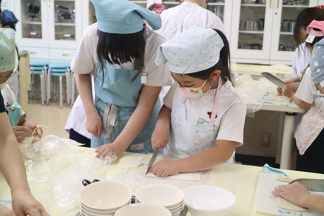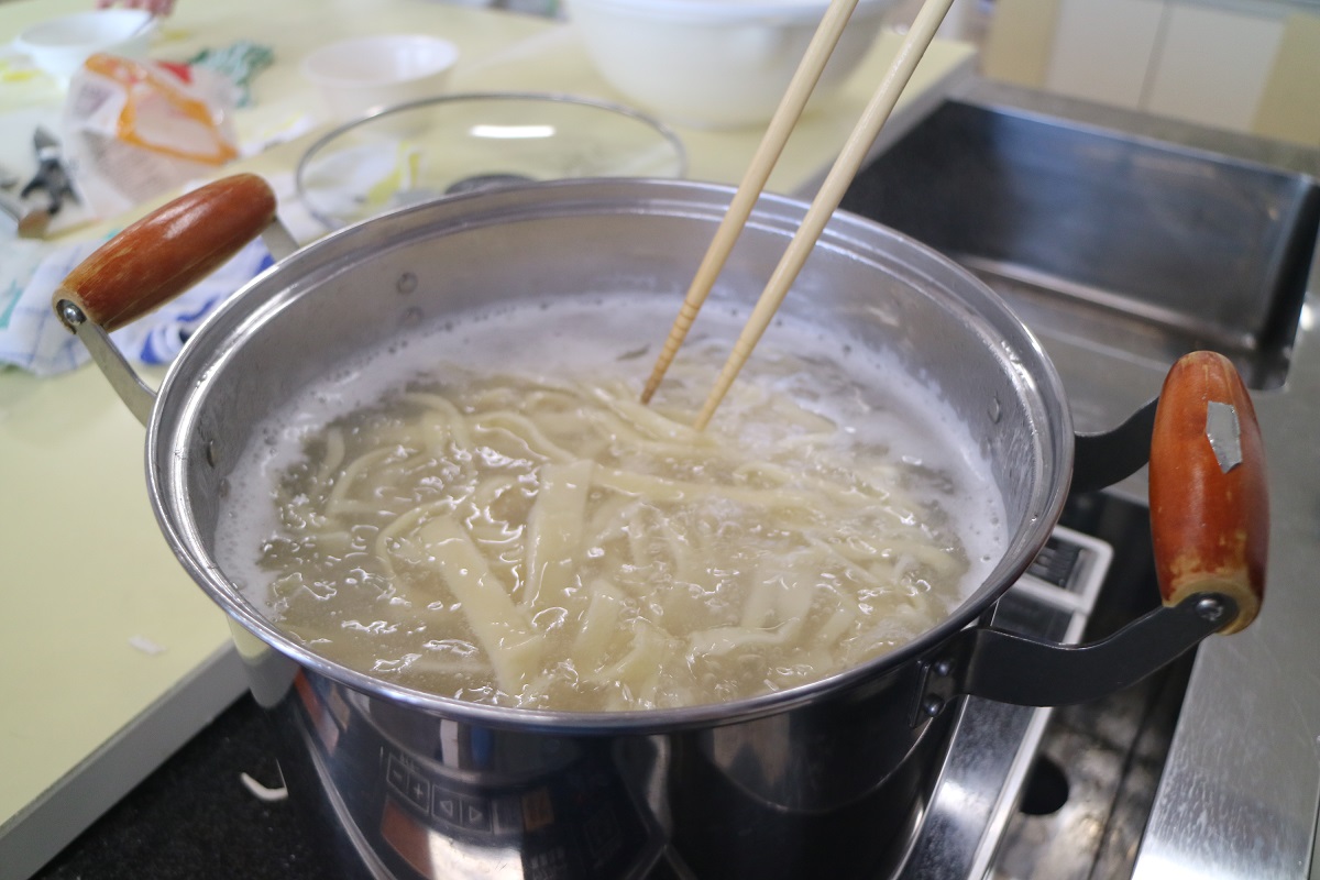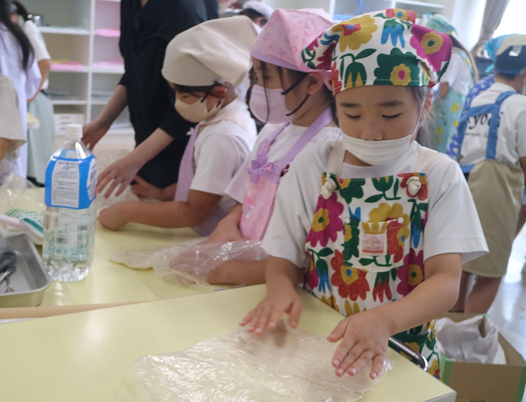 ピザのように生地を広げて…いざ、包丁で切っていきます!
